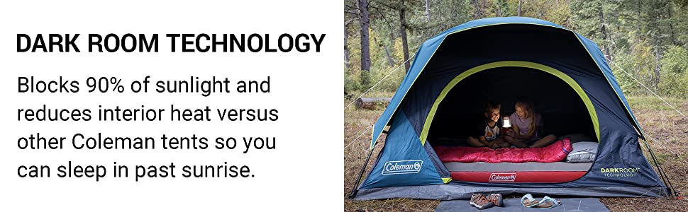 DARK ROOM TECHNOLOGY: Blocks 90% of sunlight so you can sleep in; reduces heat inside tent for additional comfort
