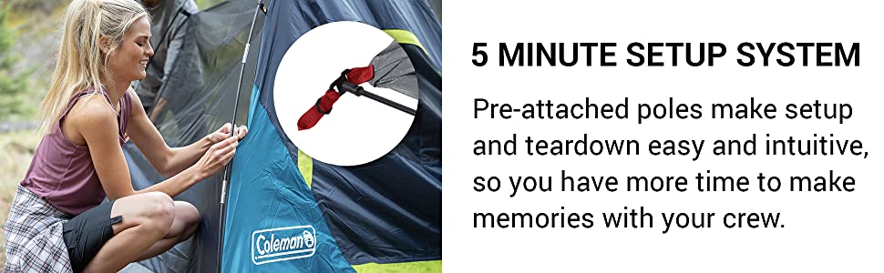 QUICK SETUP: Sets up in 5-minutes (based on average setup time with 2 people) using color-coded preatt; front left corner on tent and rainfly and brow pole sleeve are color coded red to help aid in fly orientation and setupached poles